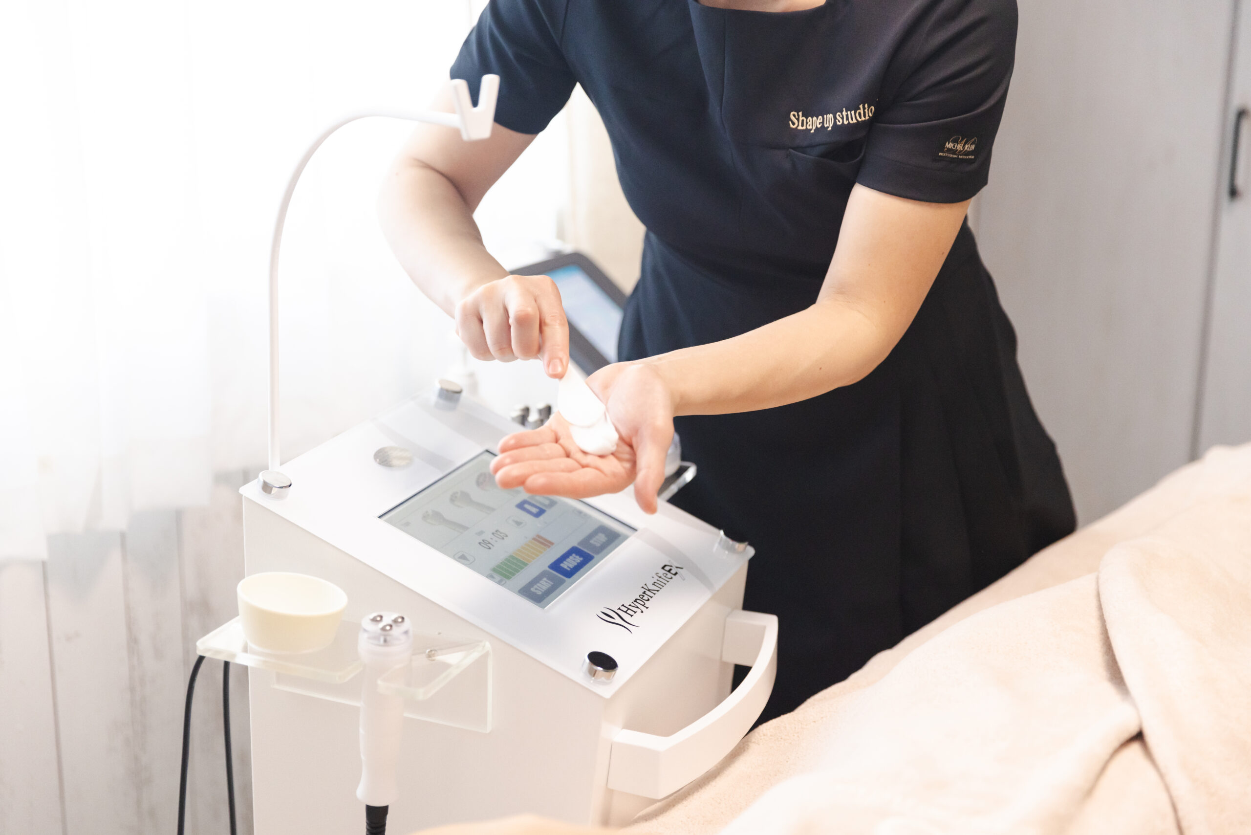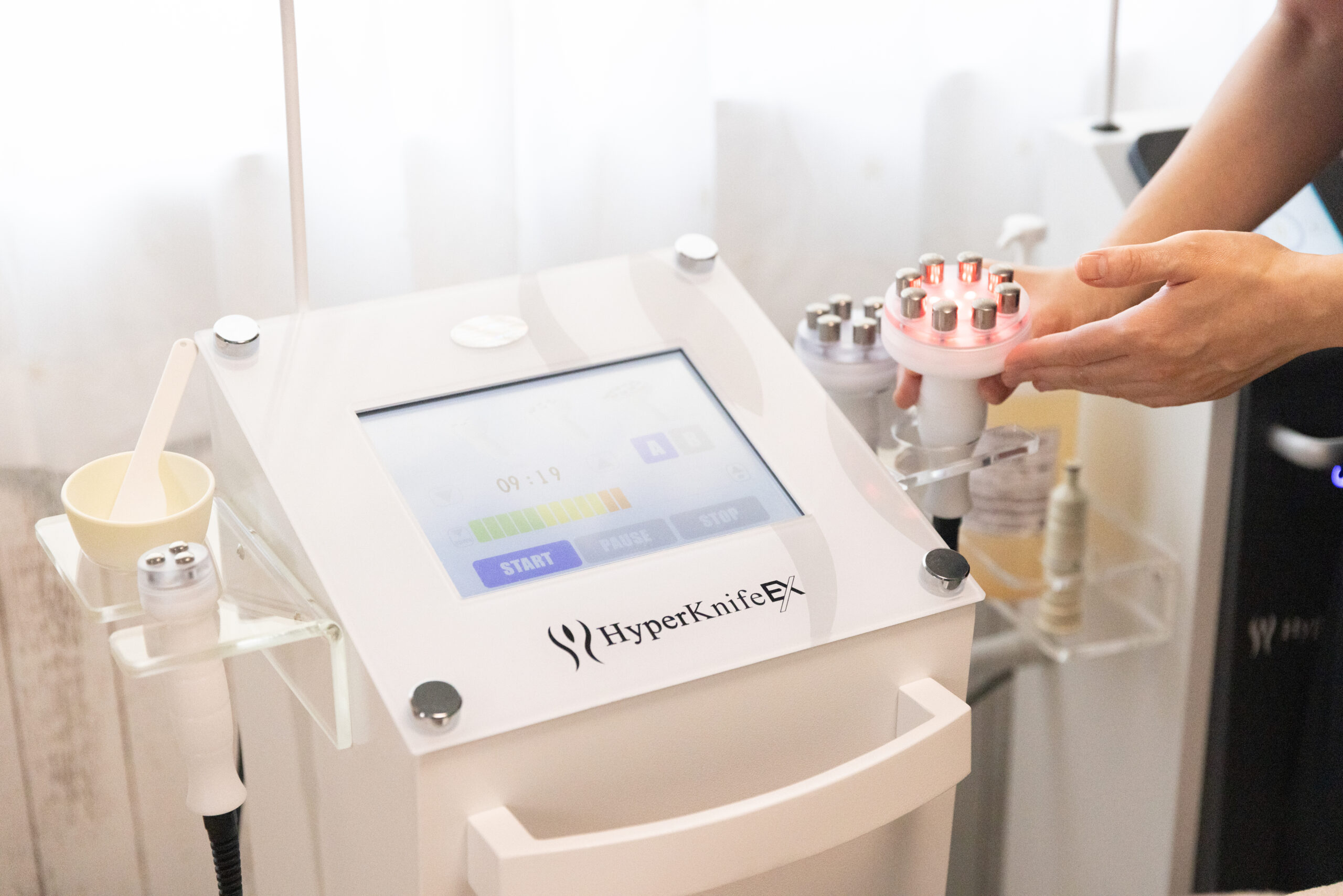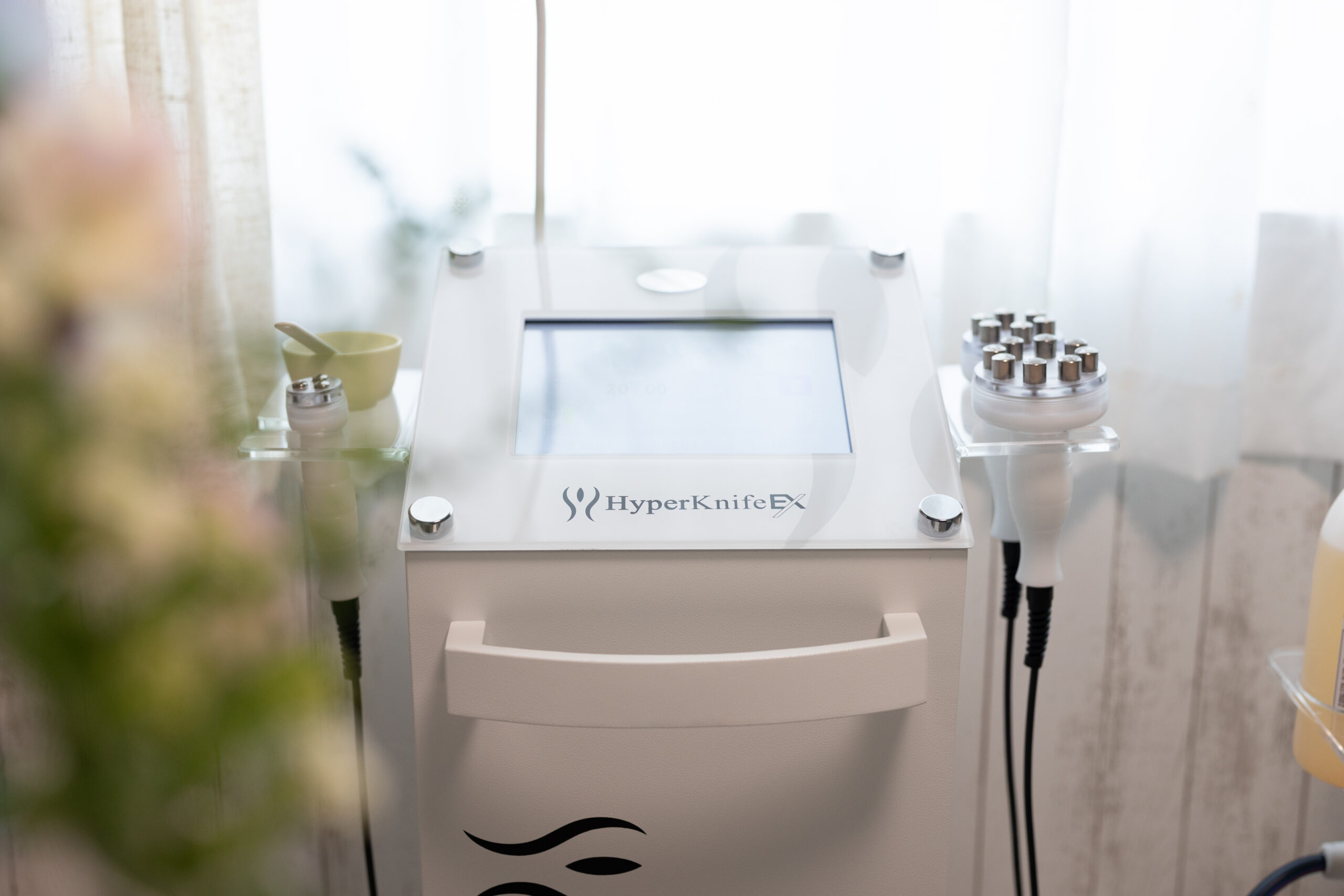 そしてアンチエイジングの側面では、”老化” しているわけではなく、乾燥からくる表面的なシワなどもあるわけで、全ての側面からESは根本的な解決はやはり『あたため』=循環をよくすること であり、ESはラインを美しく整えることに特化しているため、顔にもある老廃物やセルライトを流していくため『つぶし』も行い、フェイスラインを整え小顔に仕上げていきます。そのため機器はボディ同様 Hyper KnifeEXとHyper Shapeを使用していきます。