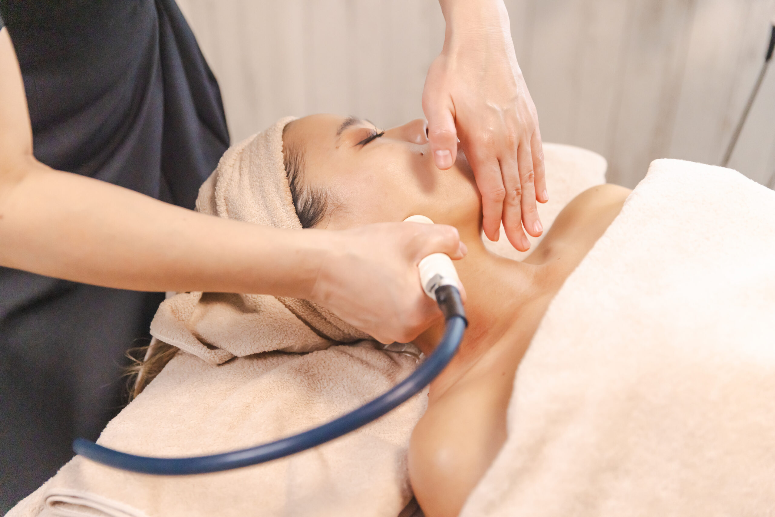ハイパーナイフEXをデコルテから当てていくことでしっかり流れをよくし、リンパ血管の通り道をスムーズにし、筋肉や脂肪細胞を柔らかくすることでコリも解れやすくなりデコルテから頭までの循環を促し、あらゆるお悩みの解消へと導きます。